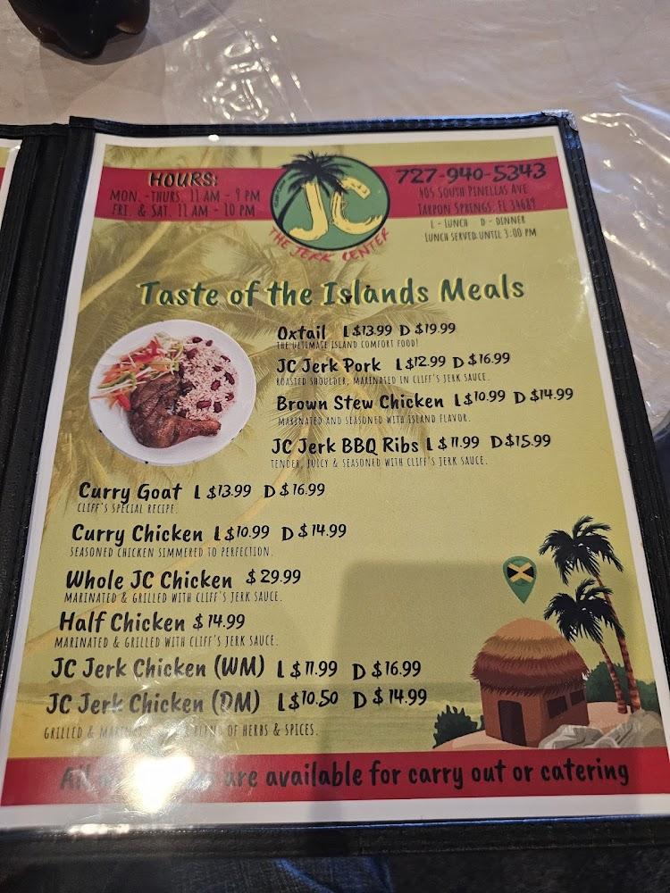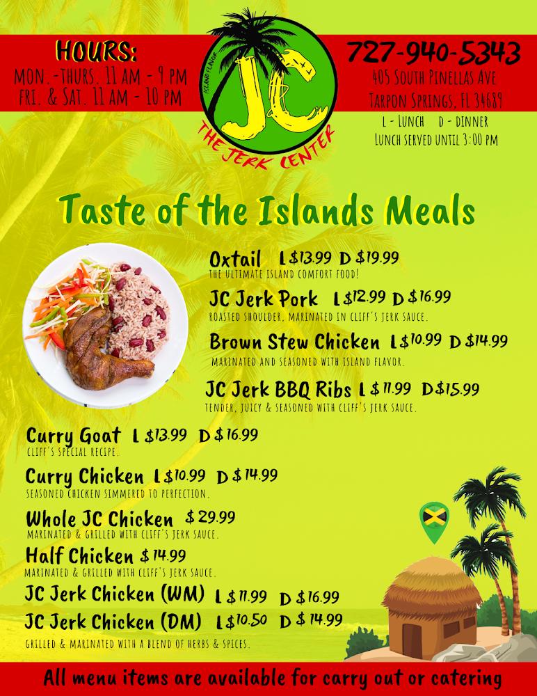 Discover the vibrant flavors of Jamaica at The Jerk Center, located in Tarpon Springs, FL. Embrace the authentic Caribbean taste with a diverse menu featuring local specialties, from savory jerk chicken to fresh vegetarian options. Whether you're dining in, taking out, or enjoying delivery, our quick service and relaxed ambiance make every meal memorable. With accessible seating and facilities, we welcome families, groups, and everyone in between. Join us for lunch or dinner, and don't miss our late-night offerings, complete with a bar serving wines and craft beers. Experience the essence of Caribbean cuisine and culture today!